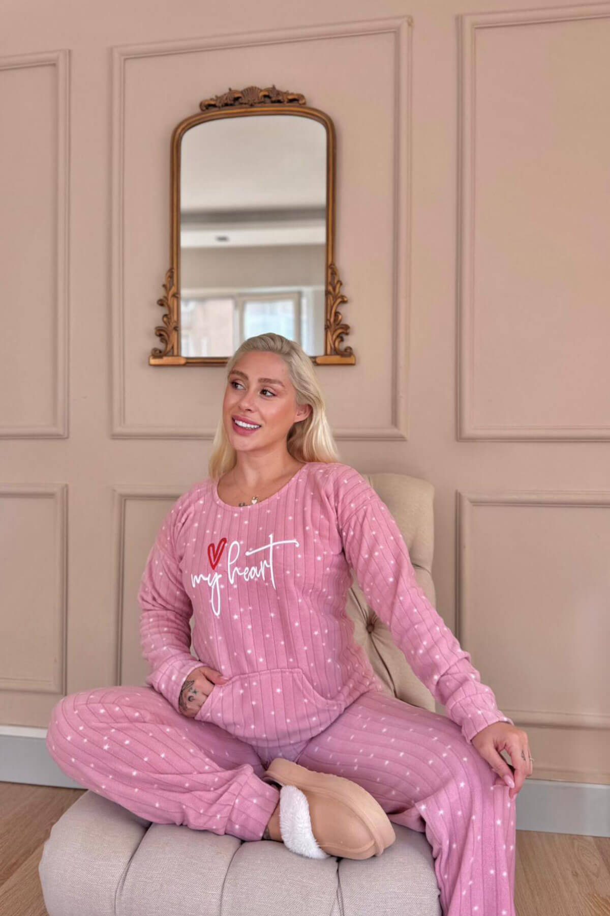 Pembe My Heart Desenli Kanguru Cepli Peluş Polar Pijama Takımı