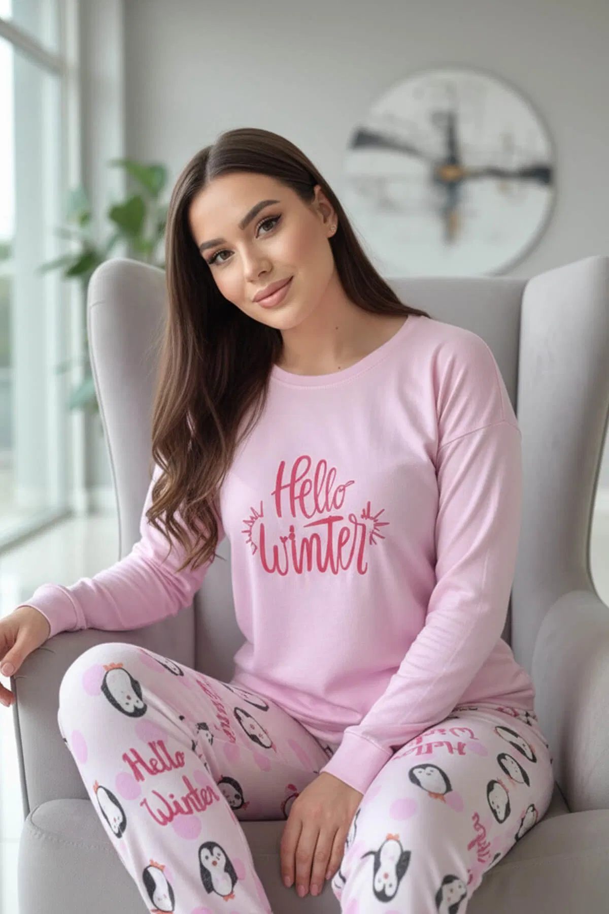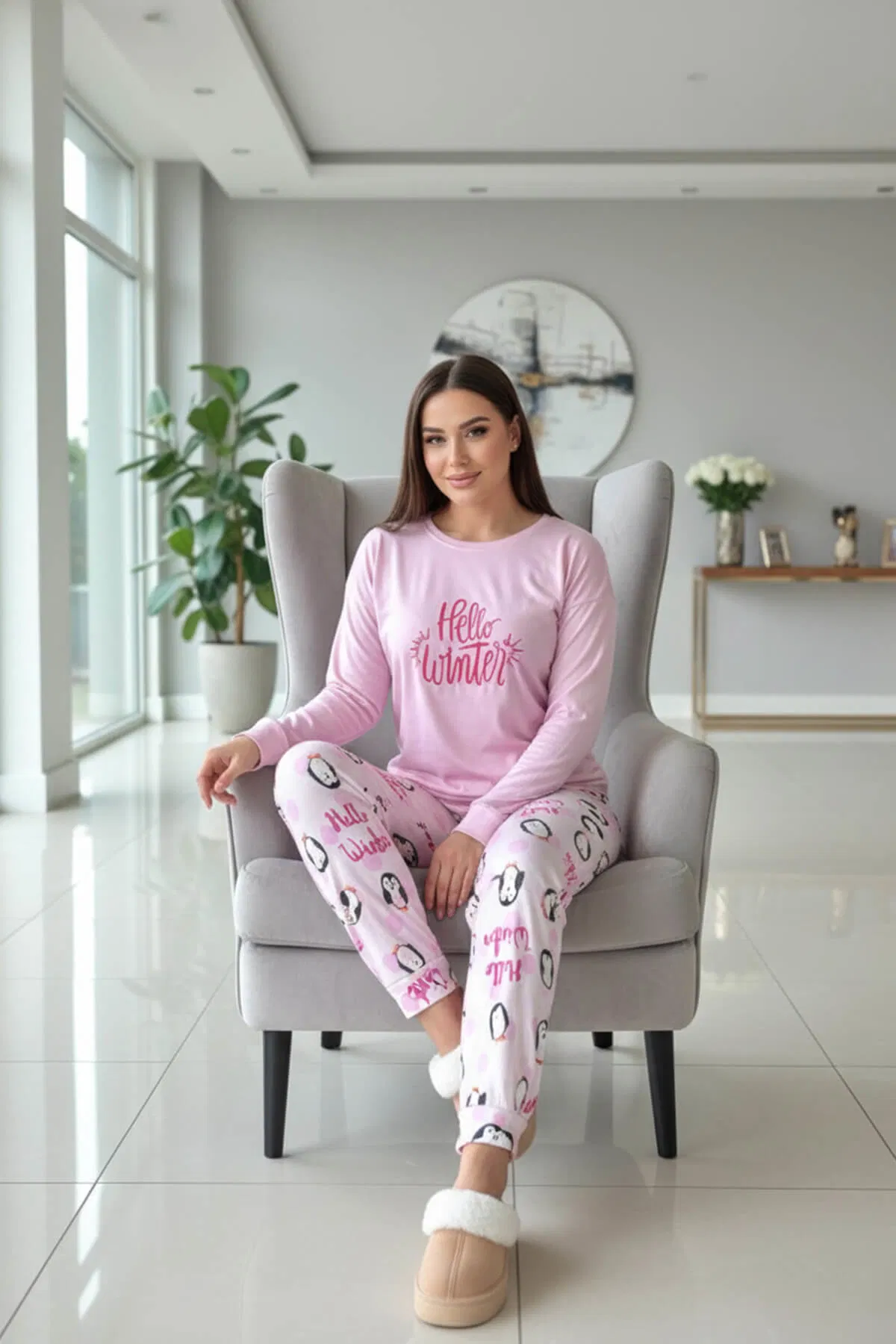 Pembe Penguen Winter Desenli Termal Kadın Pijama Takımı