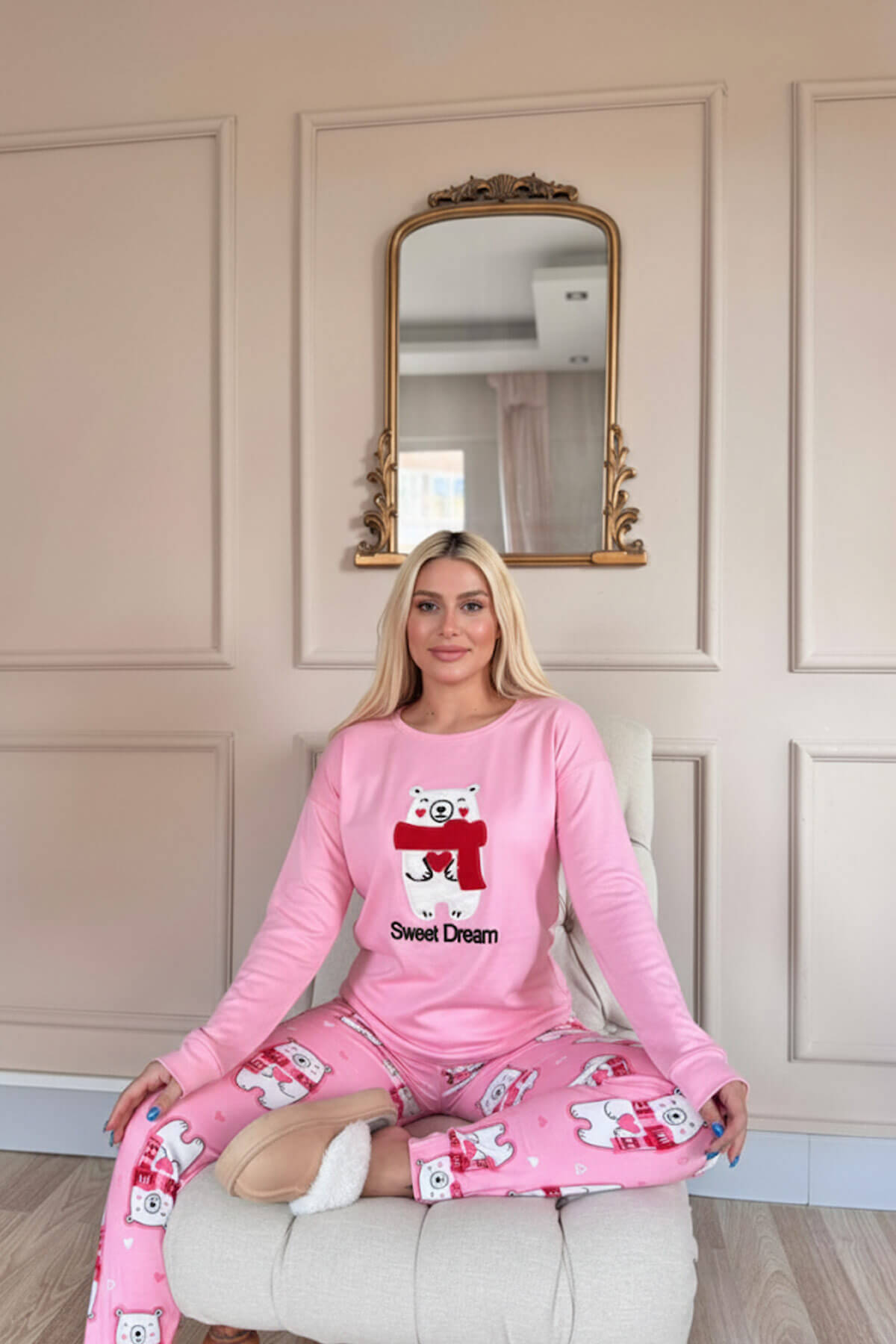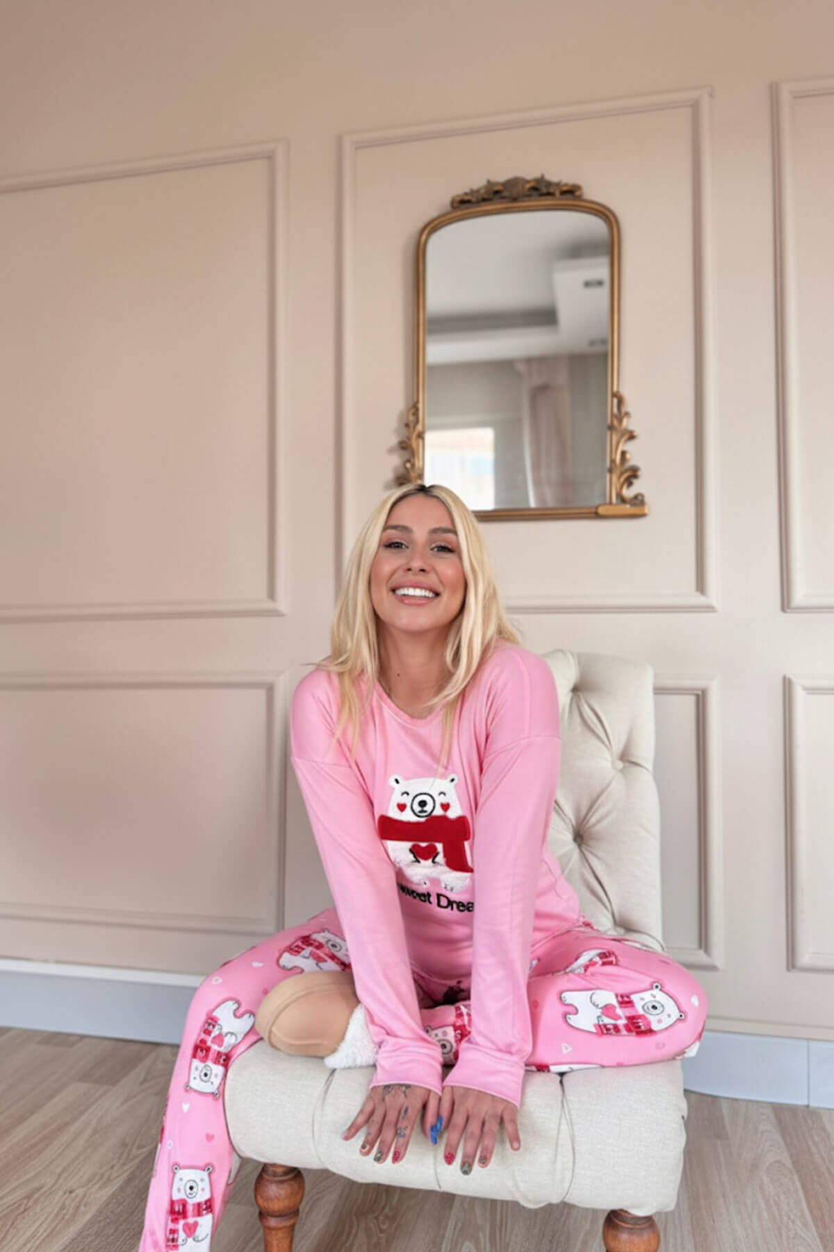 Yumuşak tuşesi sayesinde cilde nazikçe dokunan kumaşı, gün boyu rahat bir his sunarken desenli alt parçalarıyla da enerjik ve modern bir görünüm kazandırır. Sonbahar-kış kullanıma uygun yapısıyla gardırobunuzun vazgeçilmez parçalarından biri olacak.Gündelik ev şıklığı için ideal olan bu pijama takımı, rahatlığı ve tarzı bir arada sunuyor.