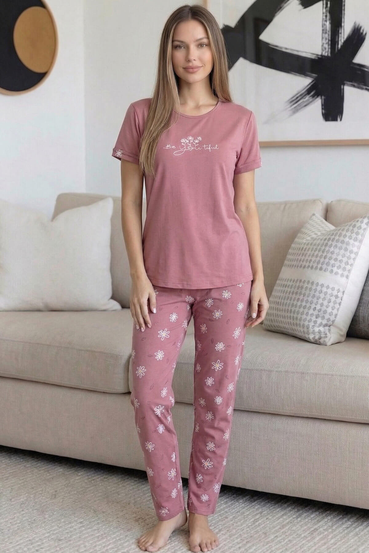 Kısa kollu bisiklet yaka üst tasarımı, modern ve sade görünüm sunarken; uzun alt parça ise rahat kalıbı ile hareket özgürlüğü sağlar. Ev giyimi, uyku ve günlük kullanım için ideal olan bu takım, yumuşak tuşesi sayesinde cilde nazik temas eder.