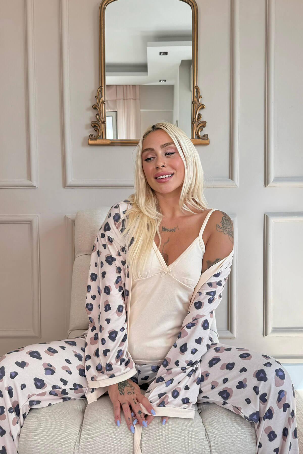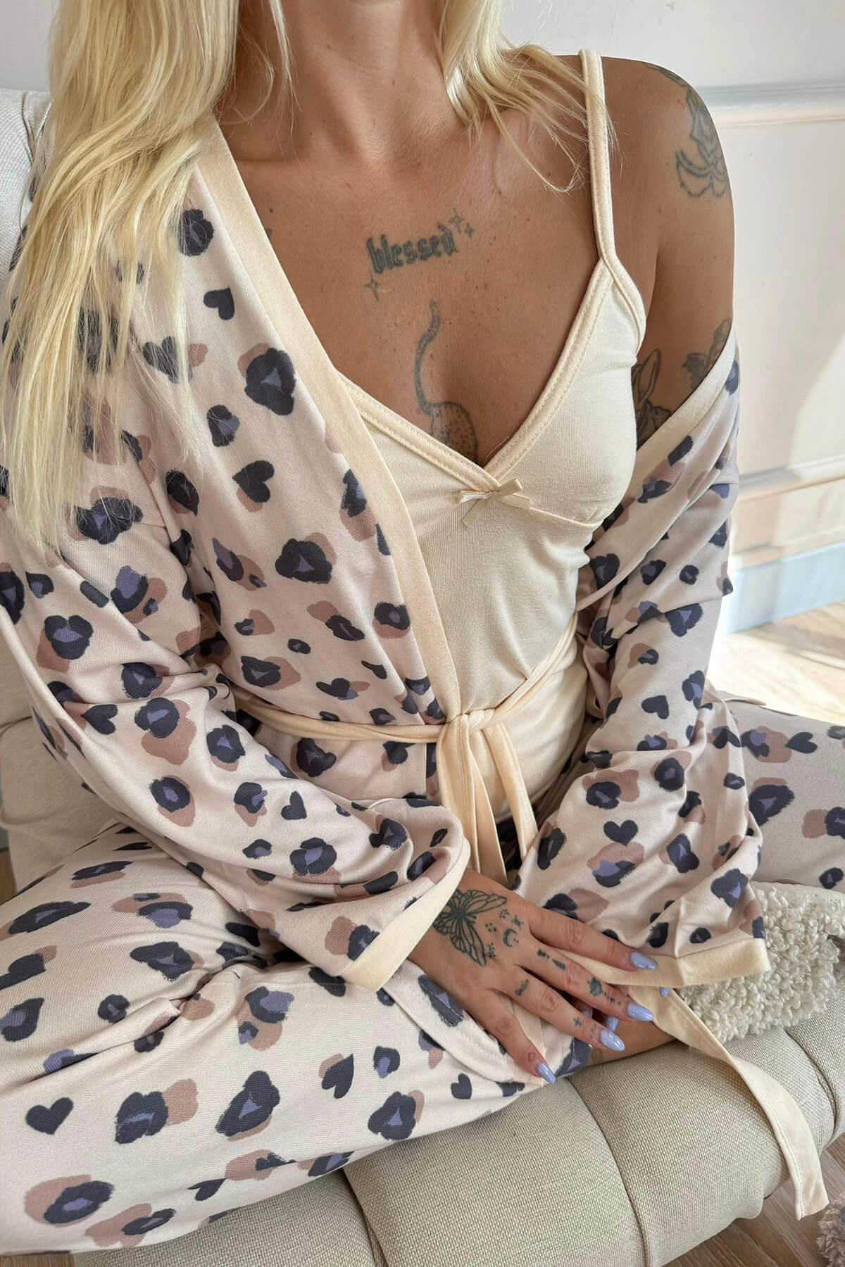 Gelince Haber VerBu şık ve rahat Pijamaevi Sarı Termal Pijama Takımı, soğuk kış aylarında hem konfor hem de sıcaklık arayanlar için mükemmel bir seçimdir. Sarı zemin üzerine yerleştirilmiş leopar desenleri ile hem dikkat çekici hem de modern bir görünüm sunar. Takım, ince askılı bir üst, uzun alt ve sabahlıktan oluşmaktadır. Termal kumaşı sayesinde, gün boyu sıcak kalırken şık görünümünüzden ödün vermeyeceksiniz.