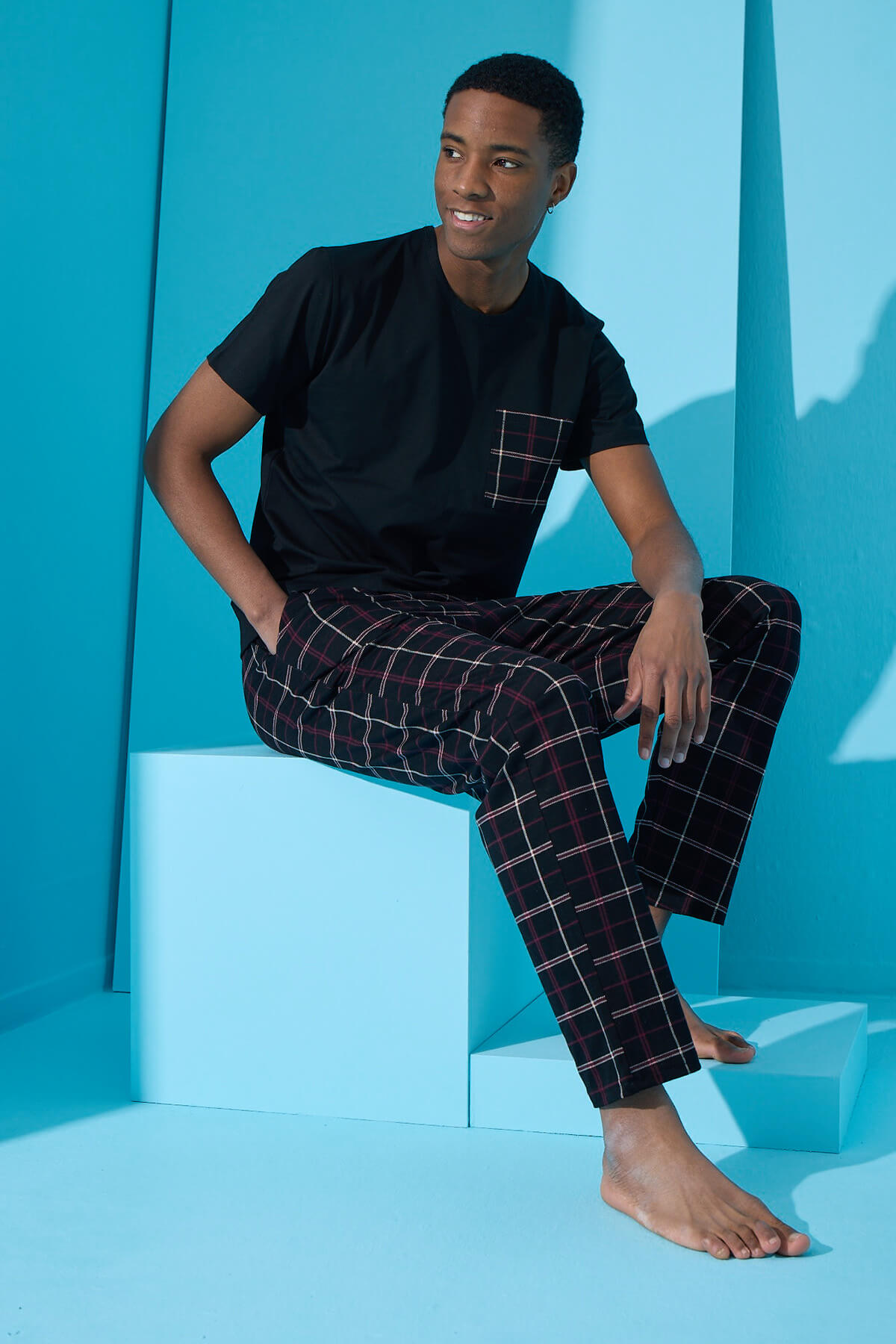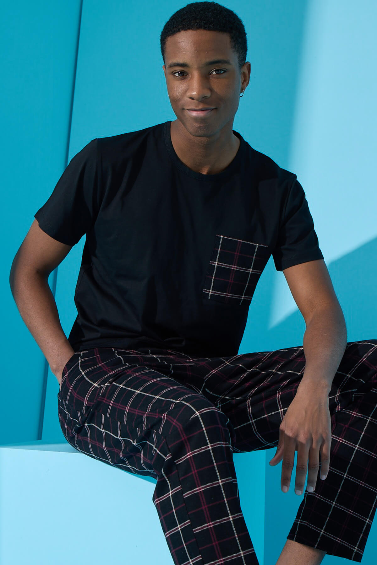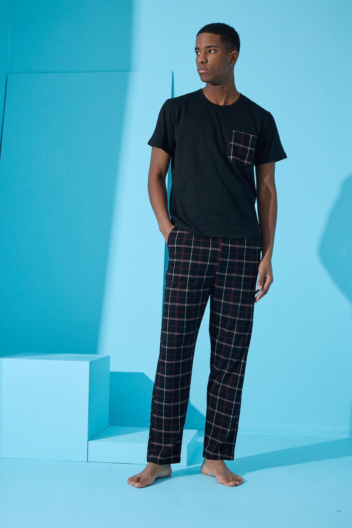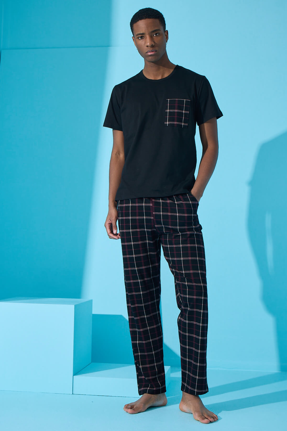 Siyah Haki Ekose Cep Detay Kısa Kollu Erkek Pijama Takımı