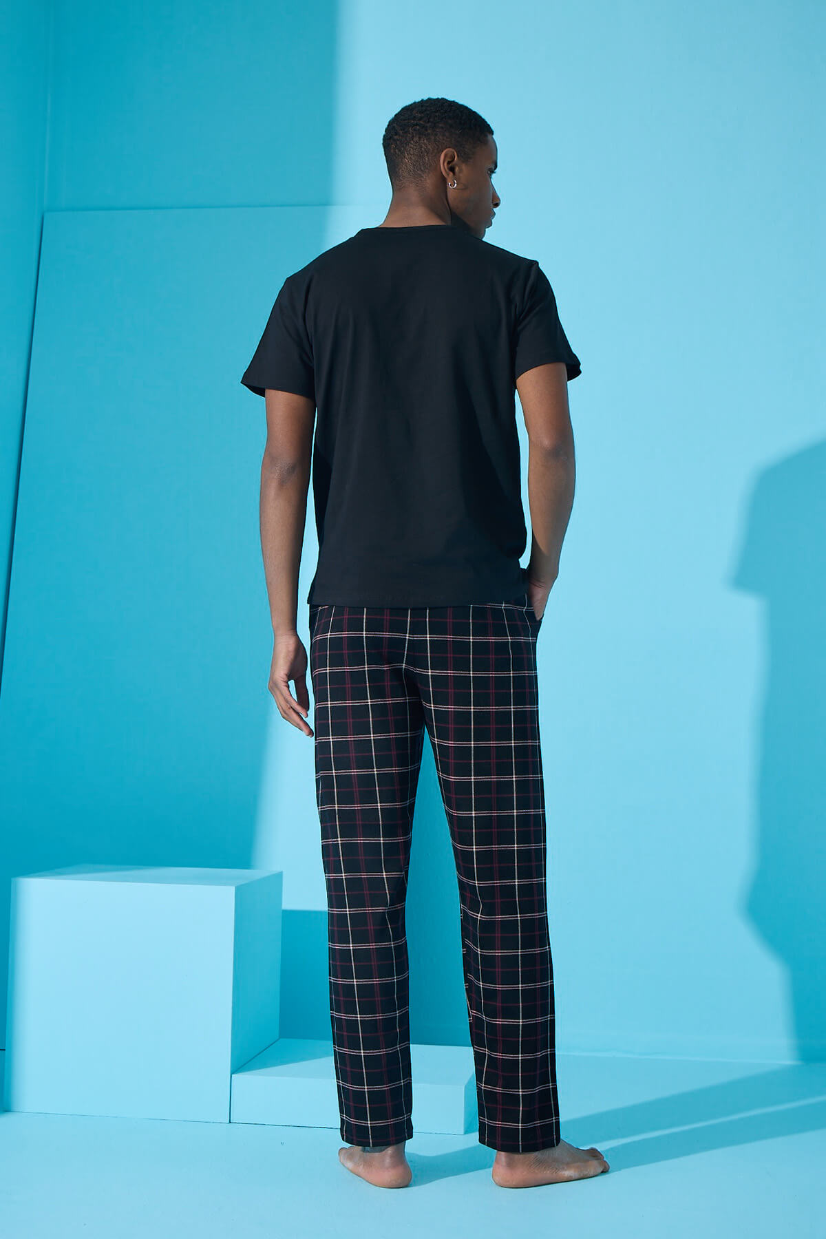 Siyah Çift Çizgi Ekose Desenli Kısa Kollu Erkek Pijama Takımı