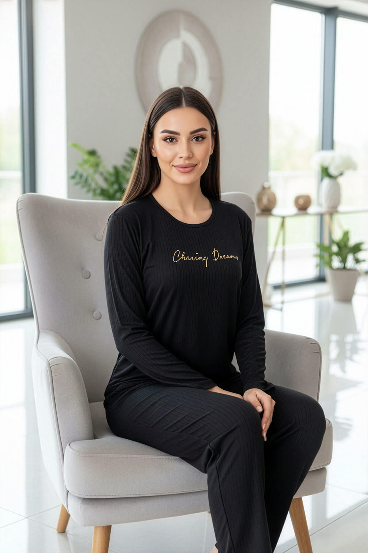 Siyah Dreams Desenli Uzun Kollu Dublin Örme Kadın Pijama Takımı