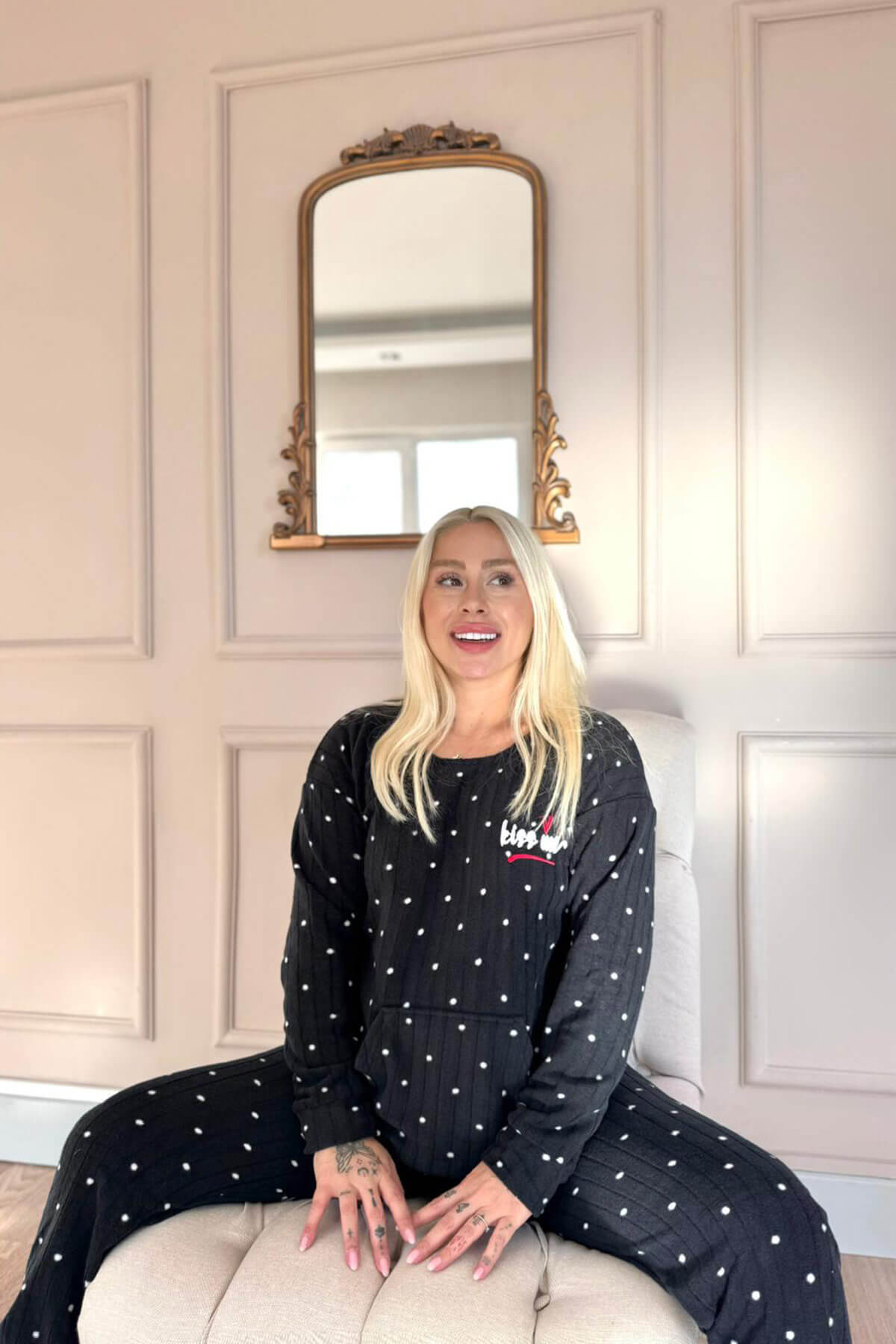 Ön kısmında yer alan kanguru cep detayı hem şıklık hem de fonksiyonellik kazandırır. Rahat kesimi sayesinde uyurken, evde dinlenirken veya keyifli anlarınızda maksimum konfor sağlar. Modern tasarımı, üzerindeki minimal desenler ve yazı detaylarıyla ev giyimine enerjik bir dokunuş katar. Soğuk günlerde hem şık görünmek hem de sıcacık hissetmek isteyen kadınların gardırobunda mutlaka bulunması gereken bir ev giyim takımıdır.