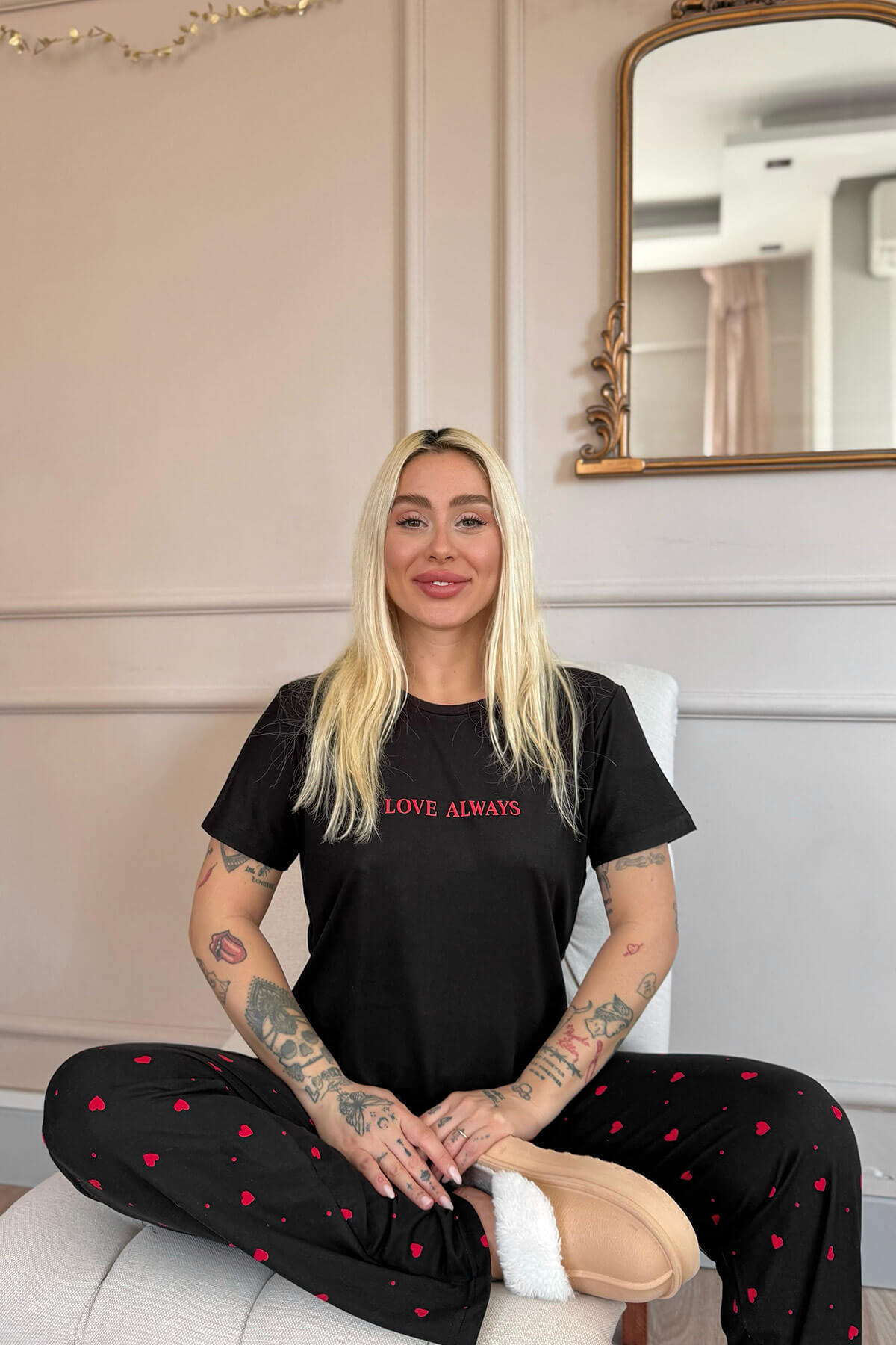 ✅ Üst Pijama: Kısa kollu, bisiklet yaka tasarımlı, yazılı baskılı t-shirt.
