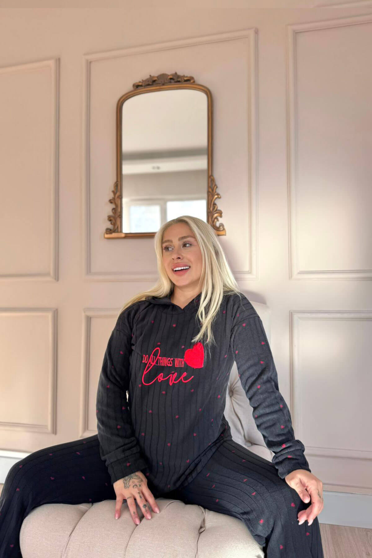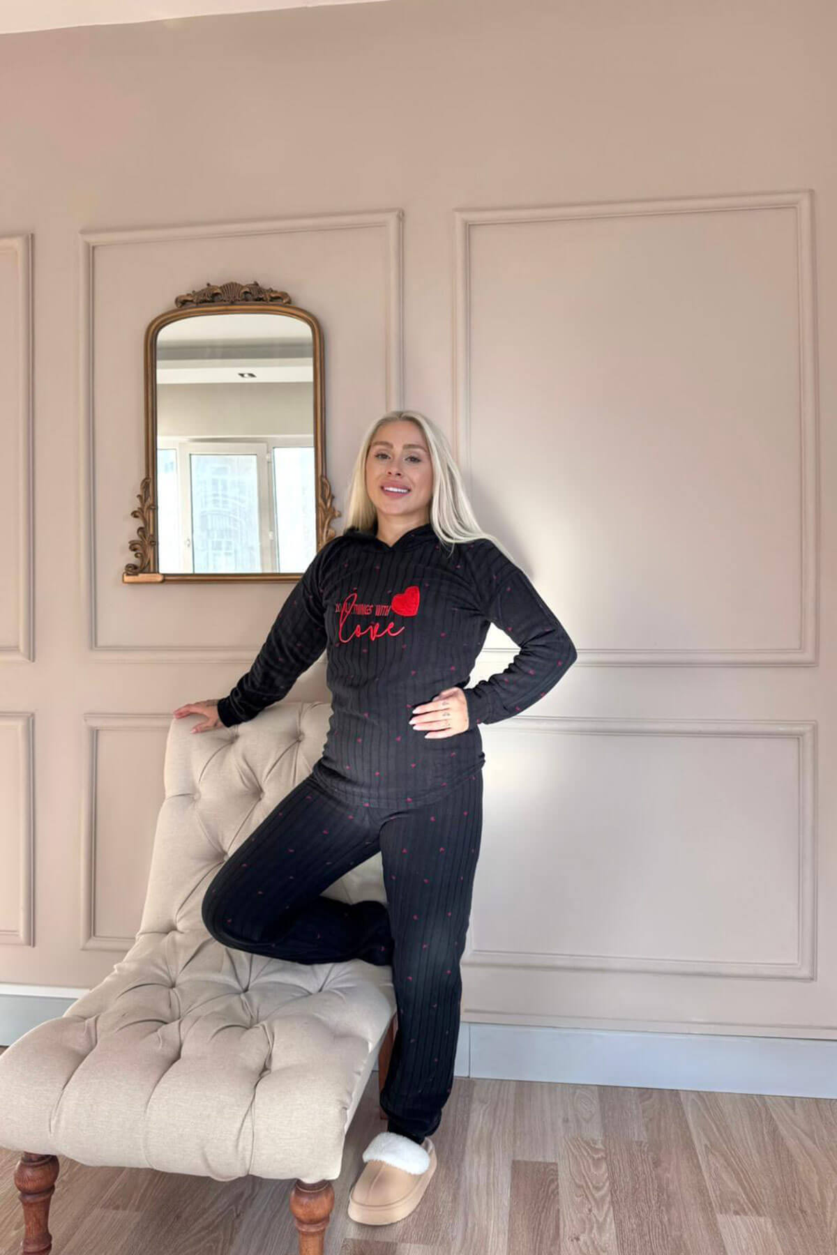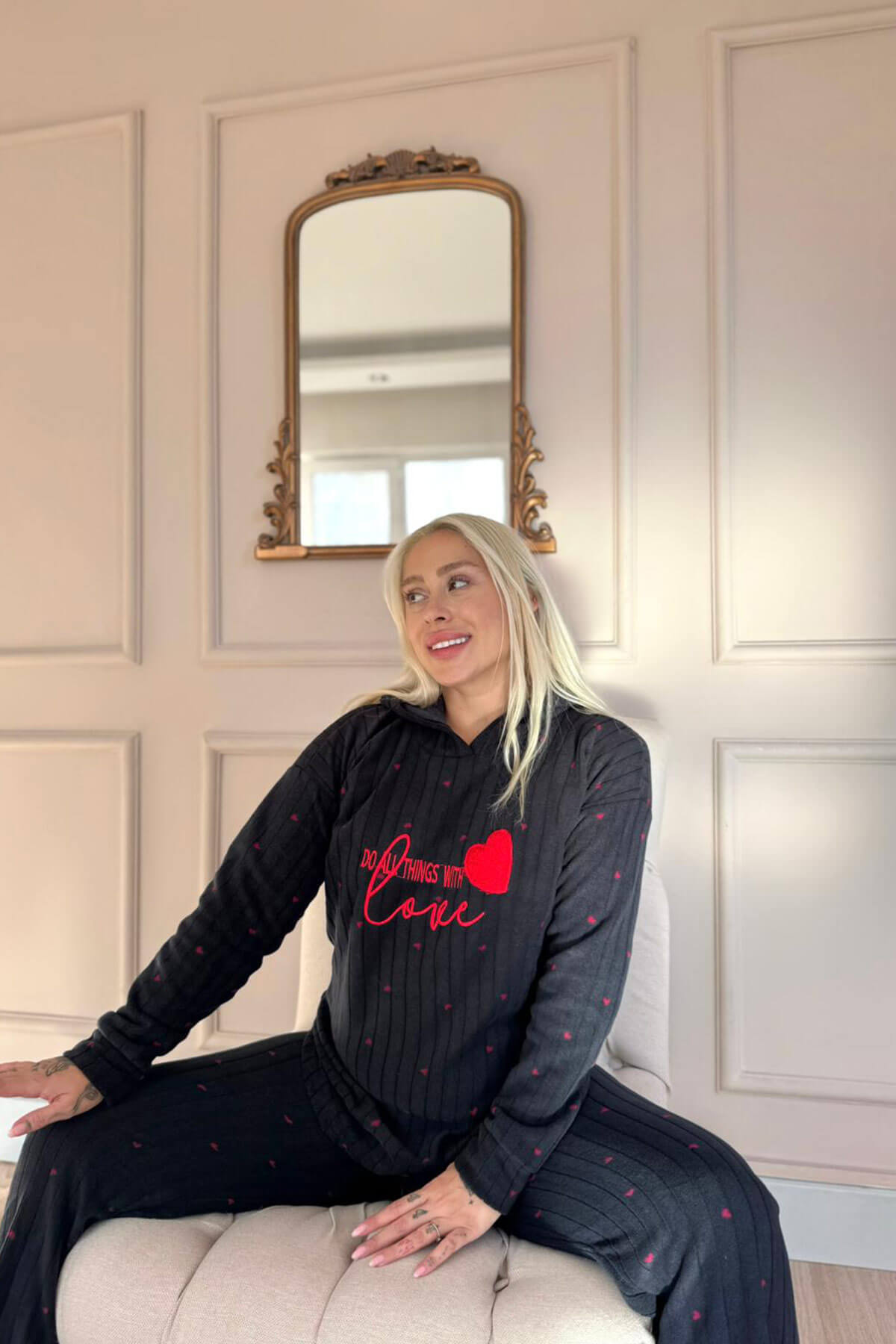Siyah Love Desenli Kapşonlu Peluş Polar Pijama Takımı