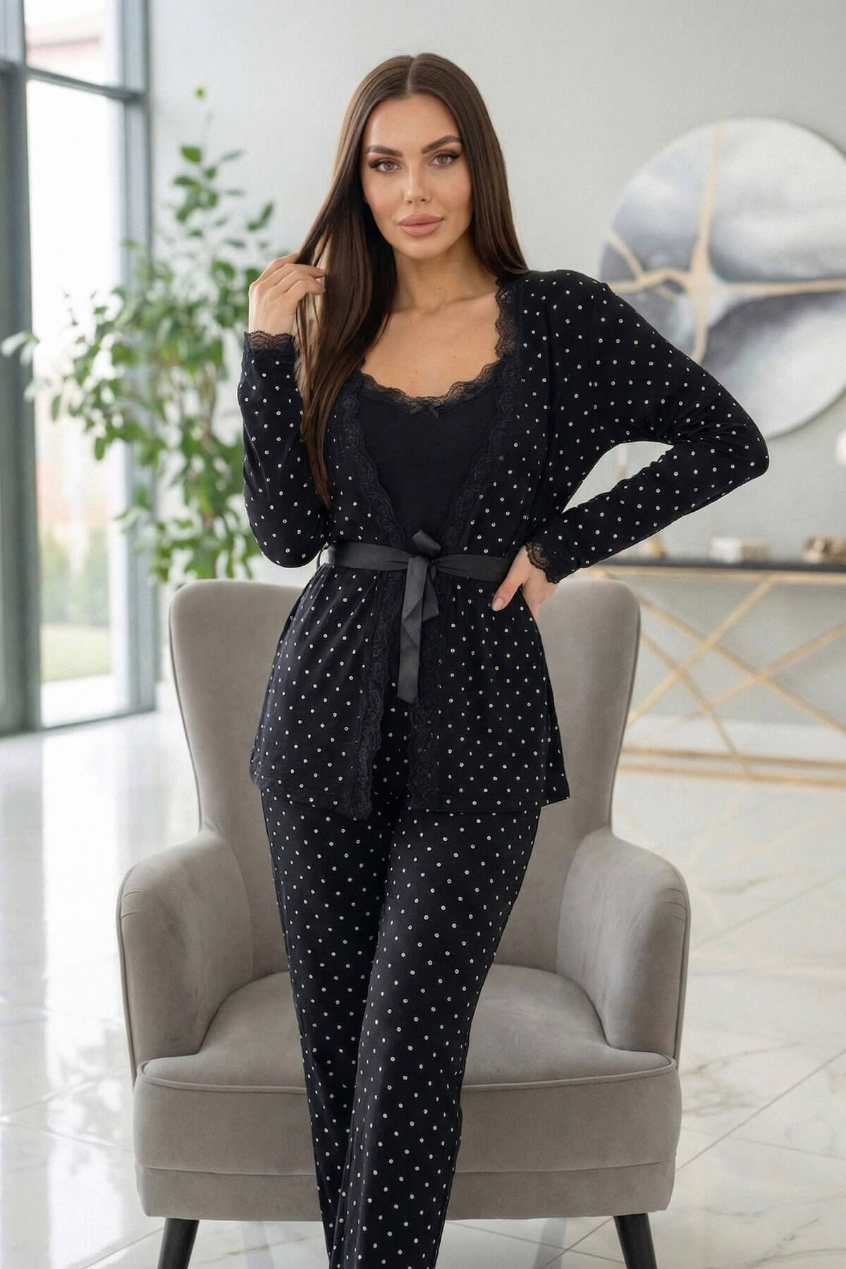 • Ürün 3 Parça Halinde,İç Pijaması Askılı Üst, Uzun Alt Pijaması, Uzun Kollu Sabahlığı, Üçlü Sabahlıklı Kadın Pijama Takımı