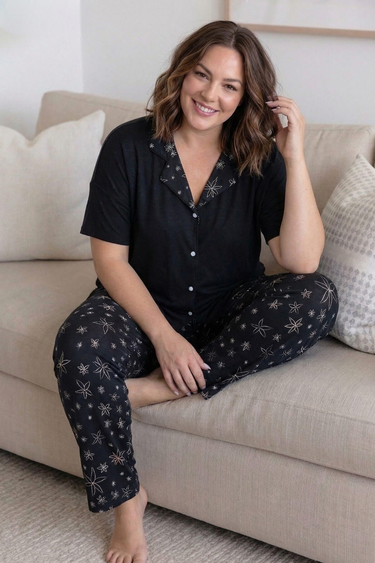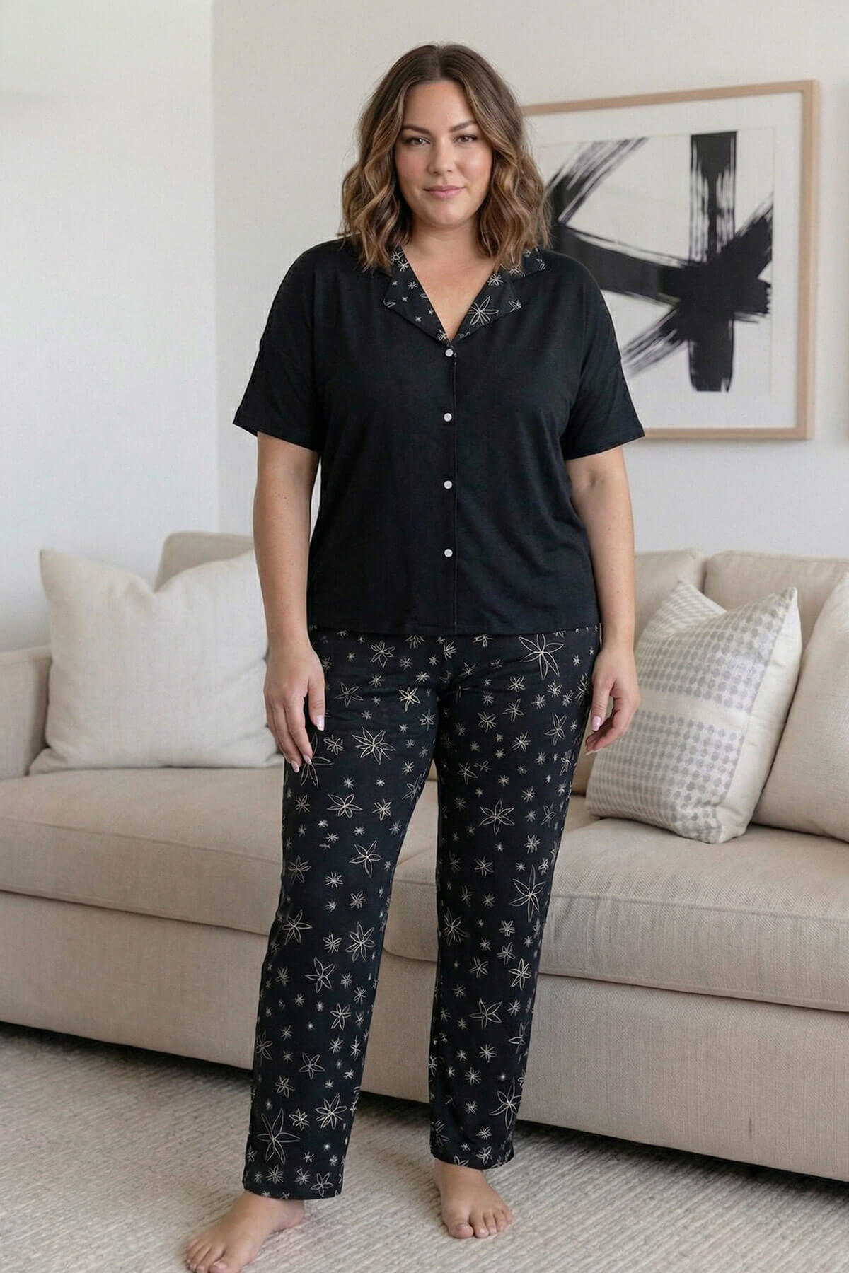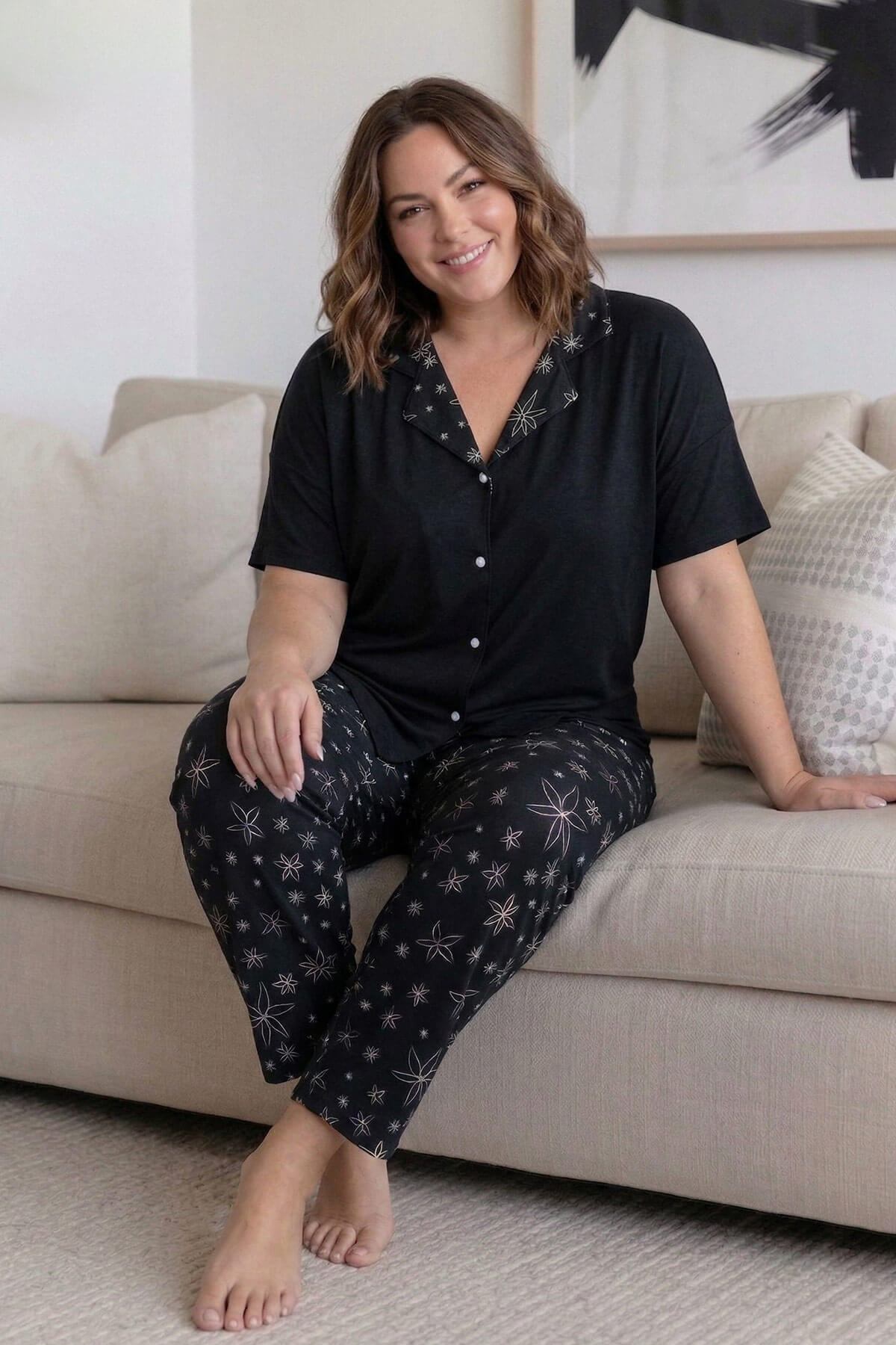 Siyah Papatya Desenli Büyük Beden Kısa Kollu Önden Düğmeli Bambu Kadın Pijama Takımı