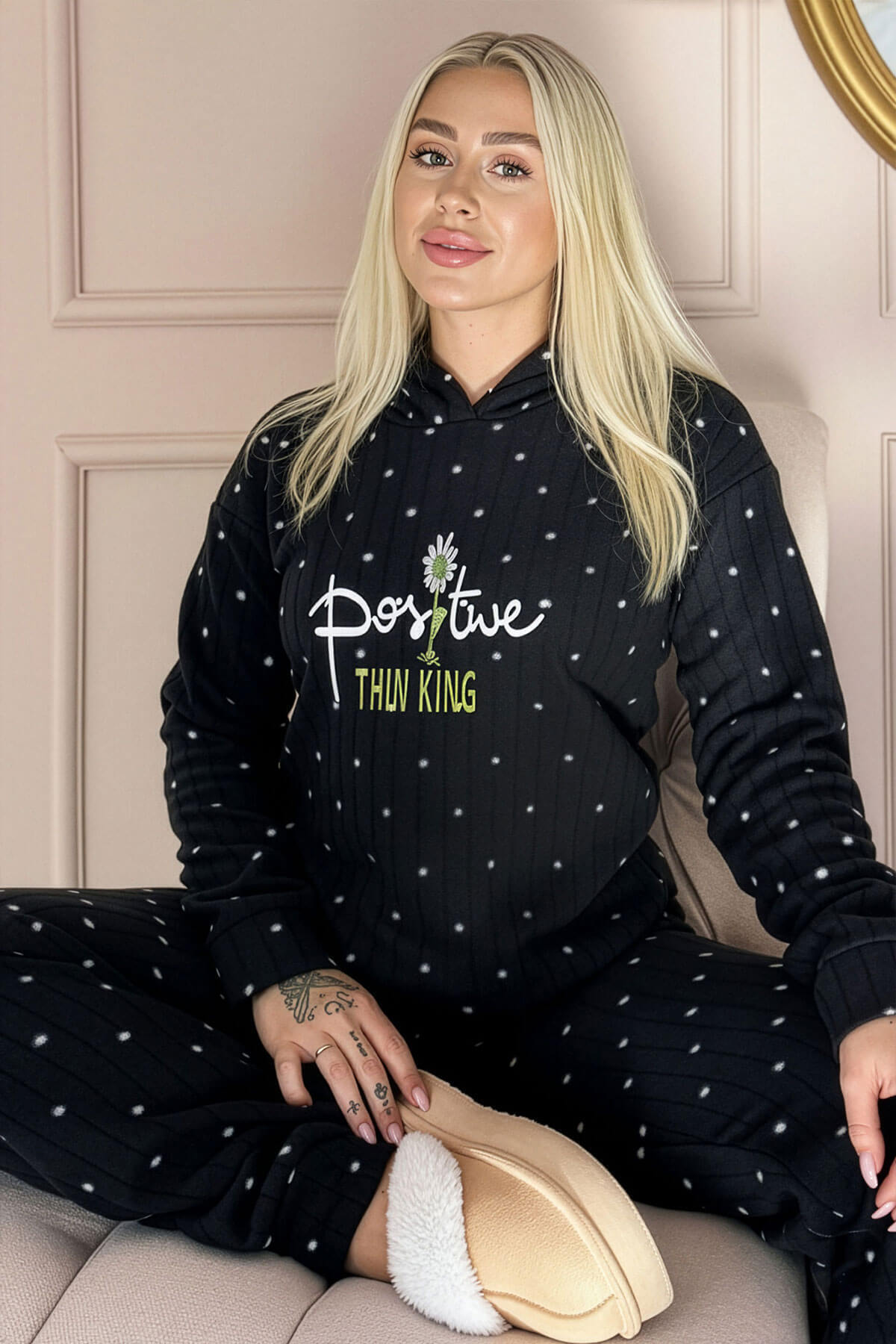 Siyah Positive Desenli Kapşonlu Peluş Polar Pijama Takımı