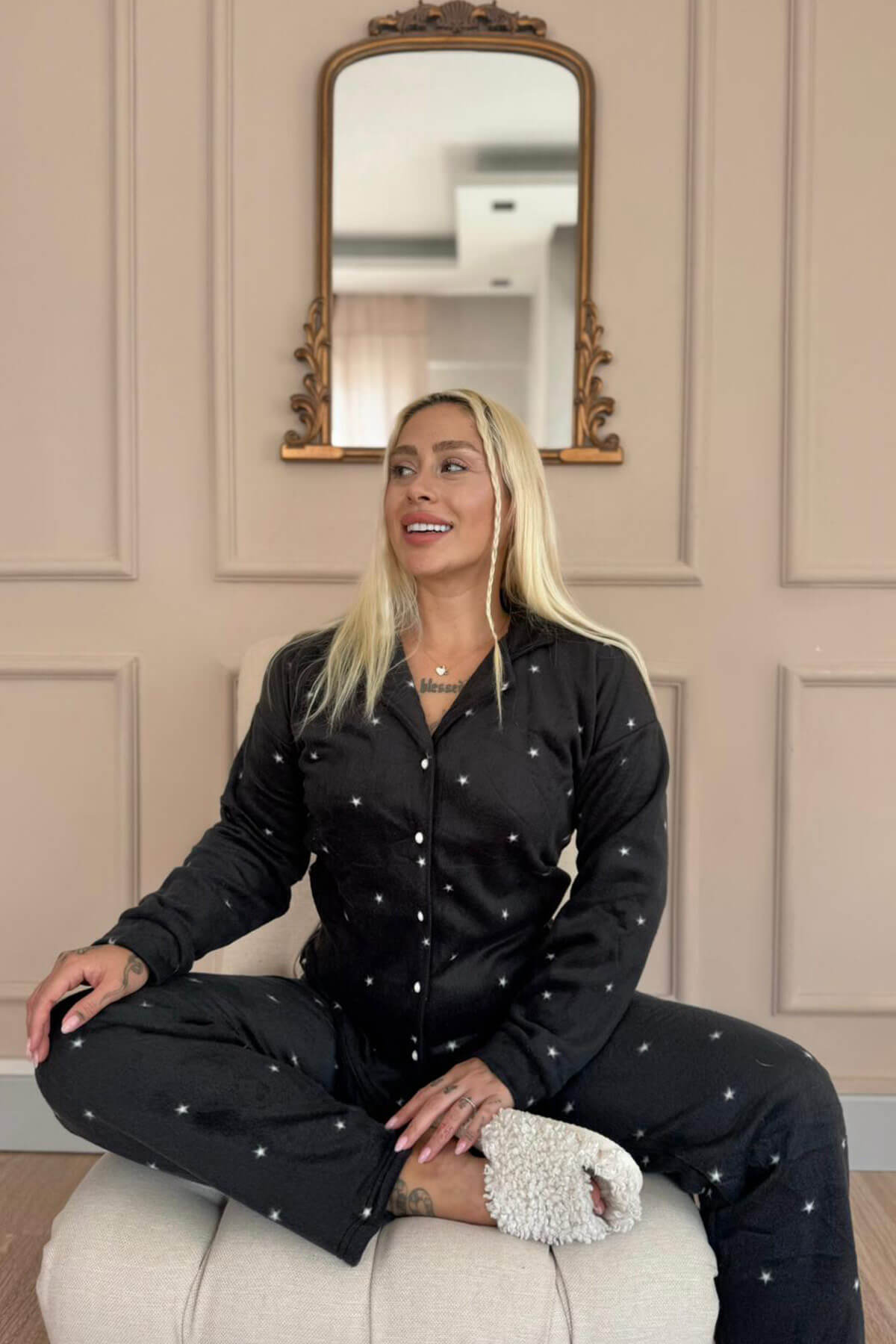 Siyah Yıldız Desenli Önden Düğmeli Peluş Polar Pijama Takımı