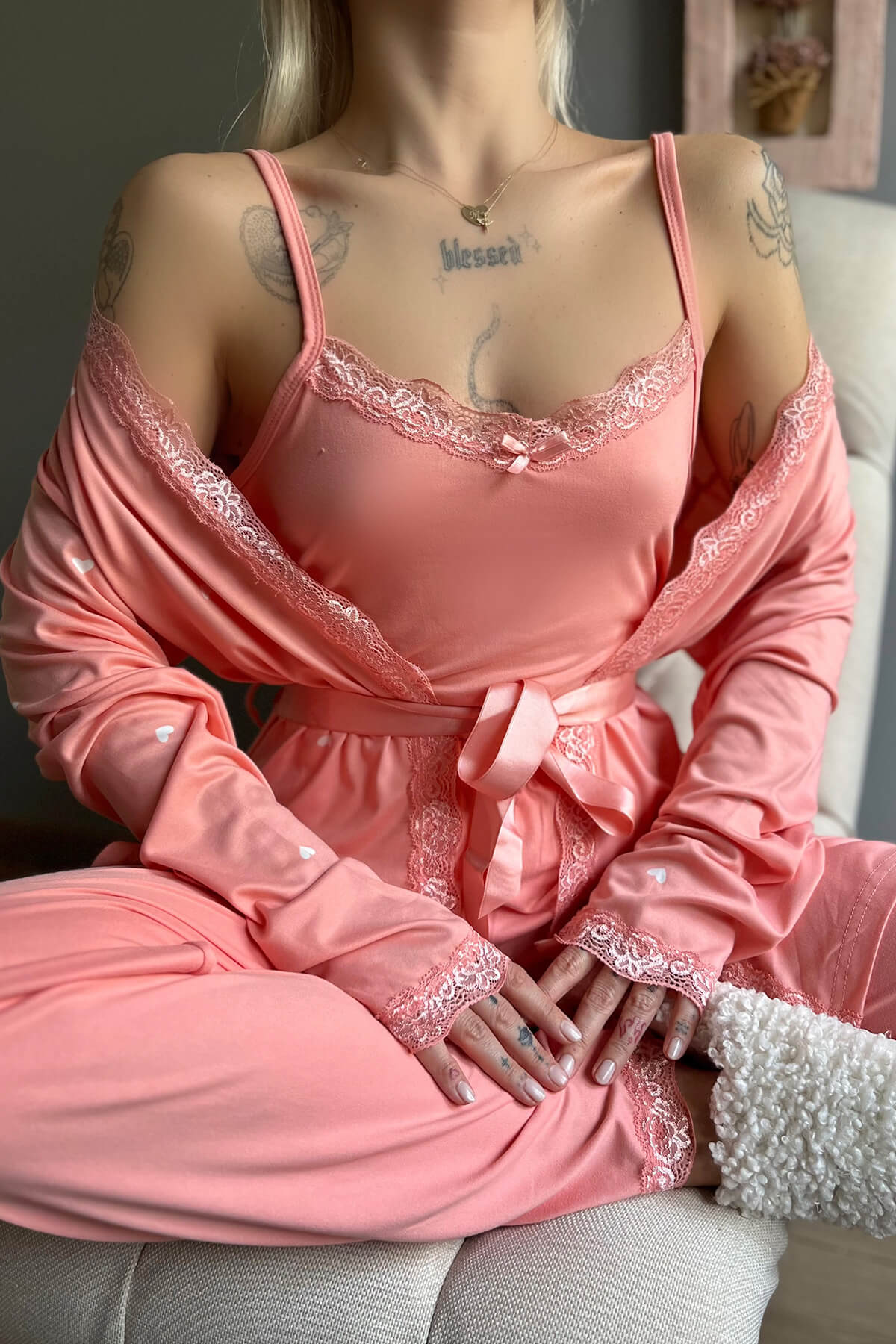 • Ürün 3 Parça Halinde,İç Pijaması Askılı Üst, Uzun Alt Pijaması, Uzun Kollu Sabahlığı, Üçlü Sabahlıklı Kadın Pijama Takımı