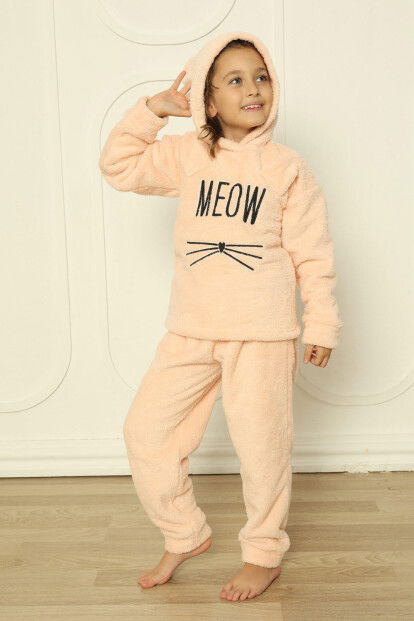 Toz Pembe Meow Desenli Tam Peluş Kız Çocuk Pijama Takımı