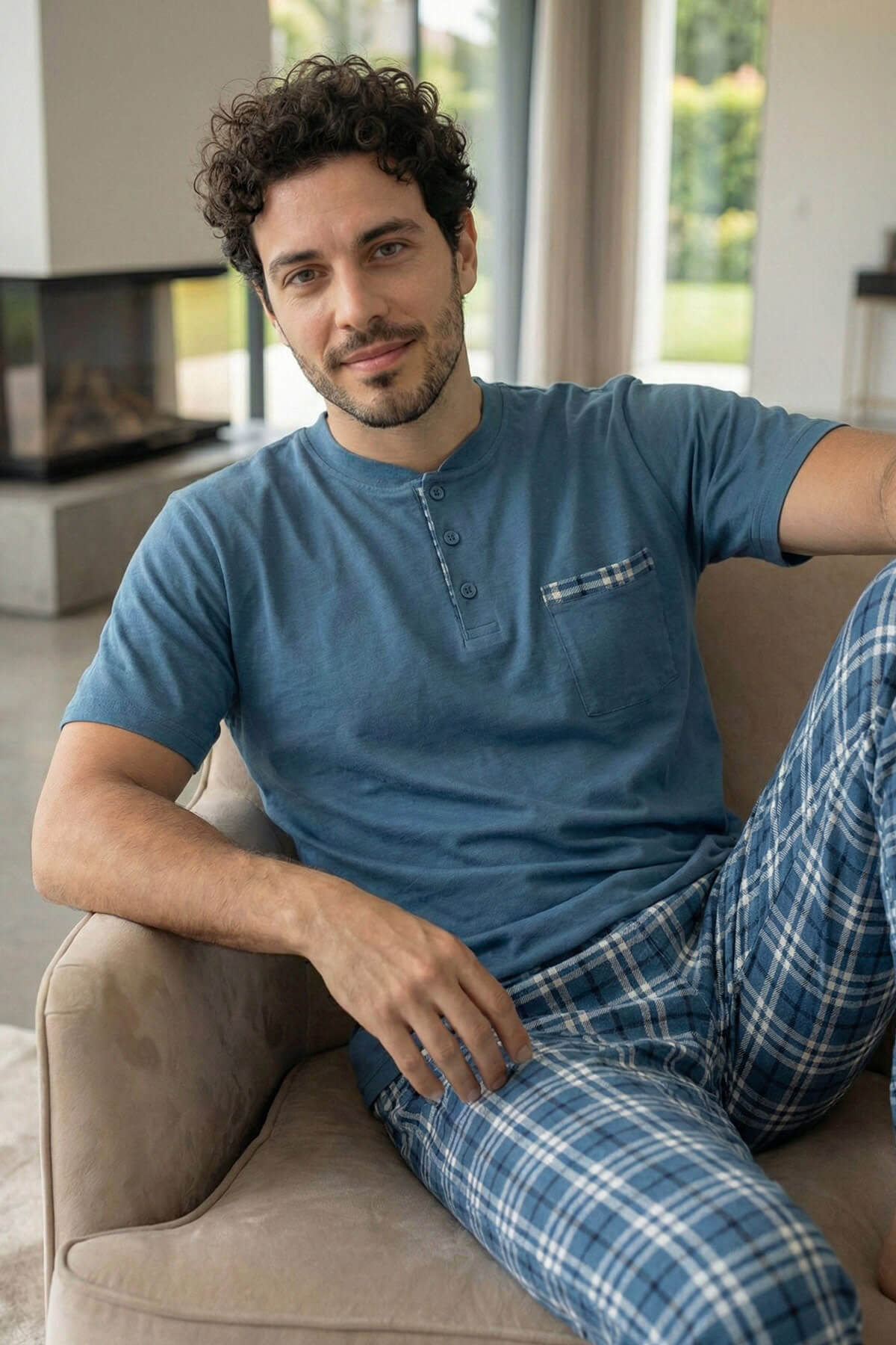 Rahat (Regular Fit) kalıbı ile vücuda yapışmadan doğal bir duruş sağlar, hareket özgürlüğünü maksimum seviyeye çıkarır. Üst parçada yer alan düğmeli yaka detayı ve cep tasarımı ürüne modern ve karakteristik bir görünüm kazandırırken, alt parçadaki desenli yapı ile bütünlüklü ve şık bir stil sunar.
