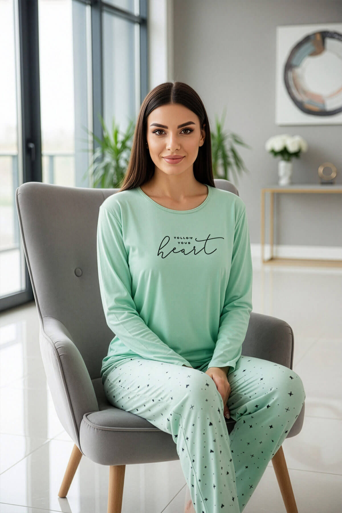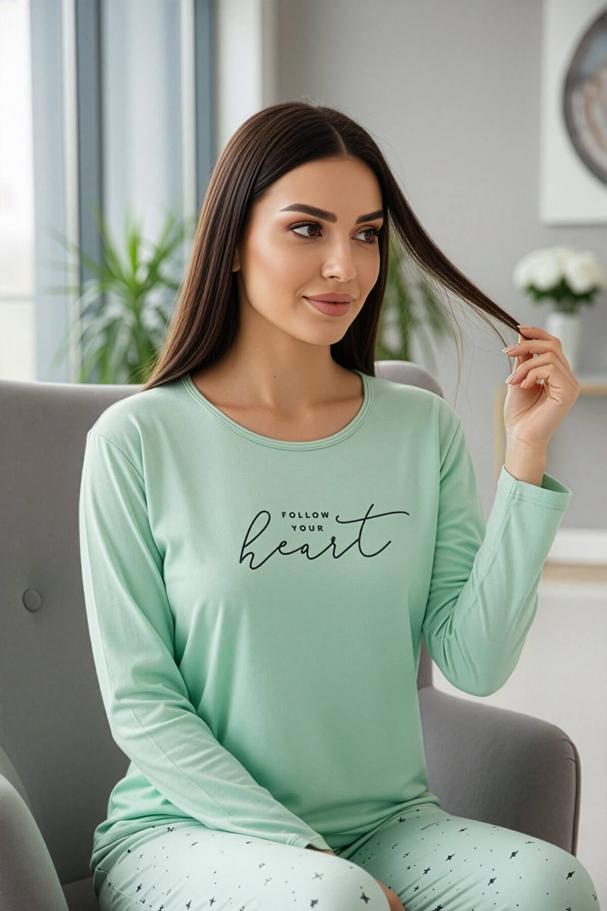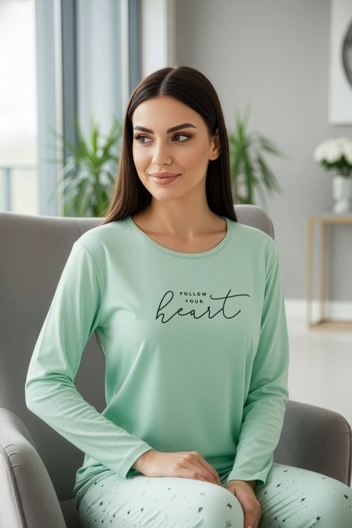 Su Yeşili Heart Desenli Uzun Kollu Bambu Örme Kadın Pijama Takımı