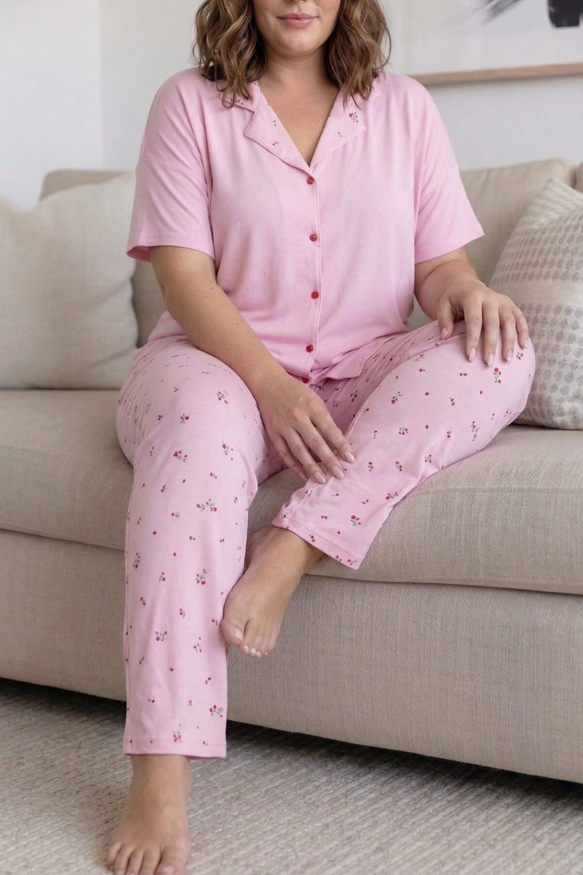Toz Pembe Flower Desenli Büyük Beden Kısa Kollu Önden Düğmeli Bambu Kadın Pijama Takımı