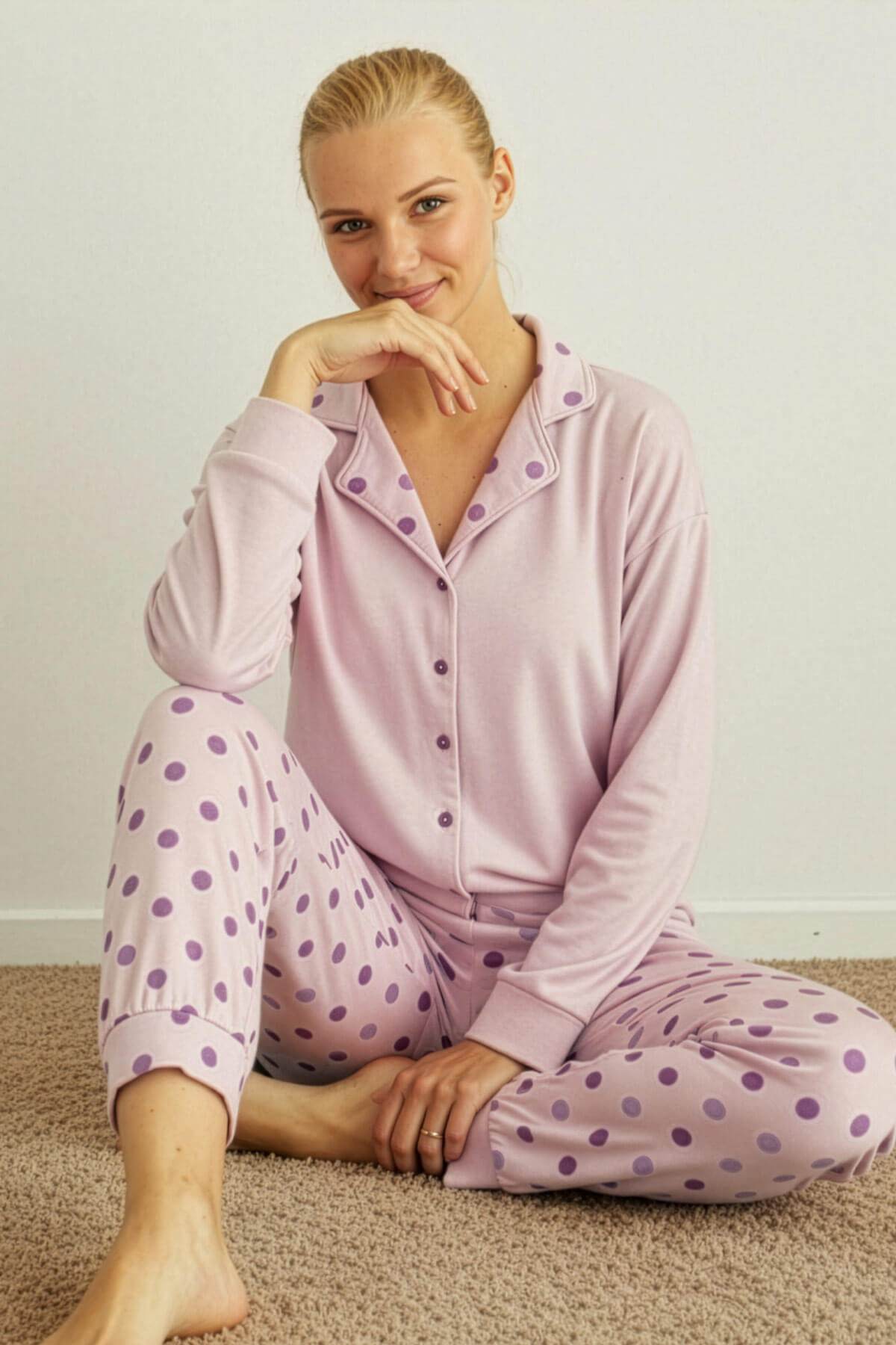 Toz Pembe Puan Desenli Termal Önden Düğmeli Uzun Kollu Kadın Pijama Takımı