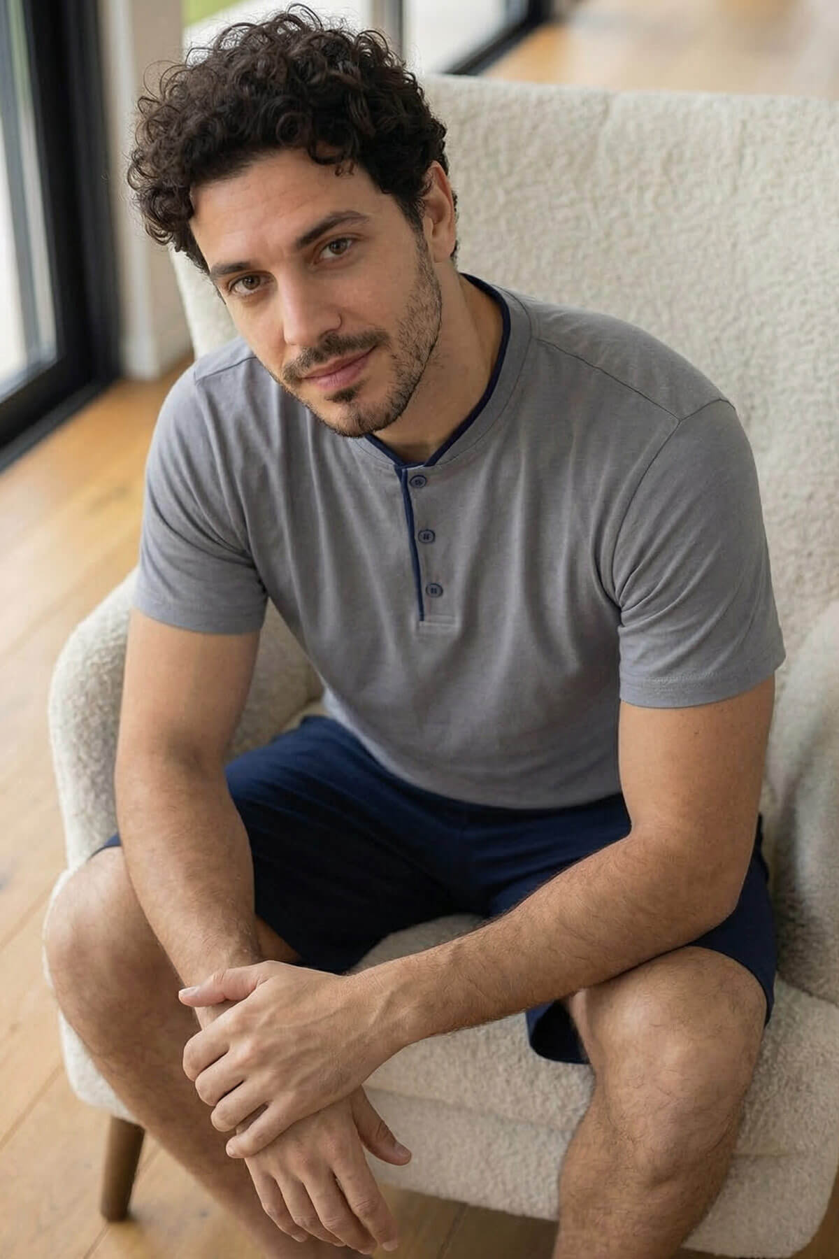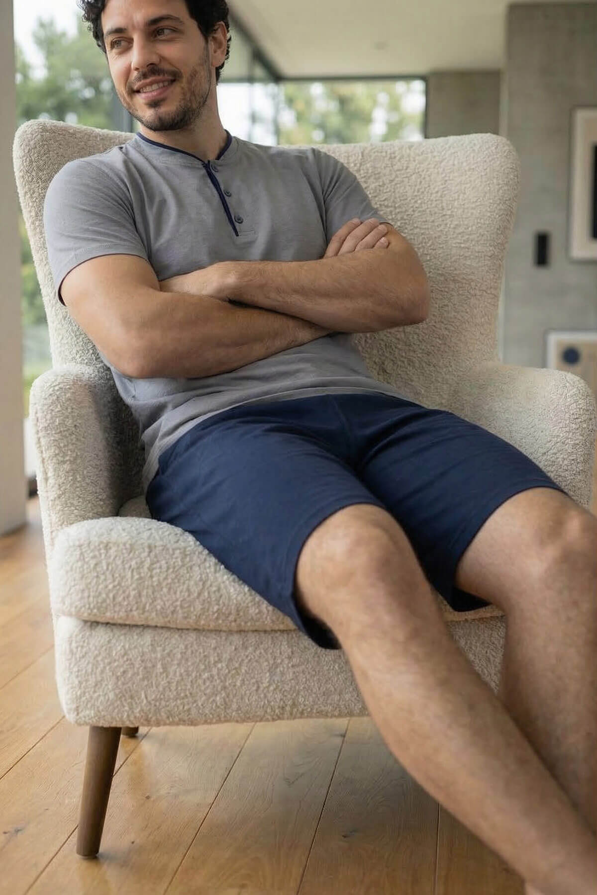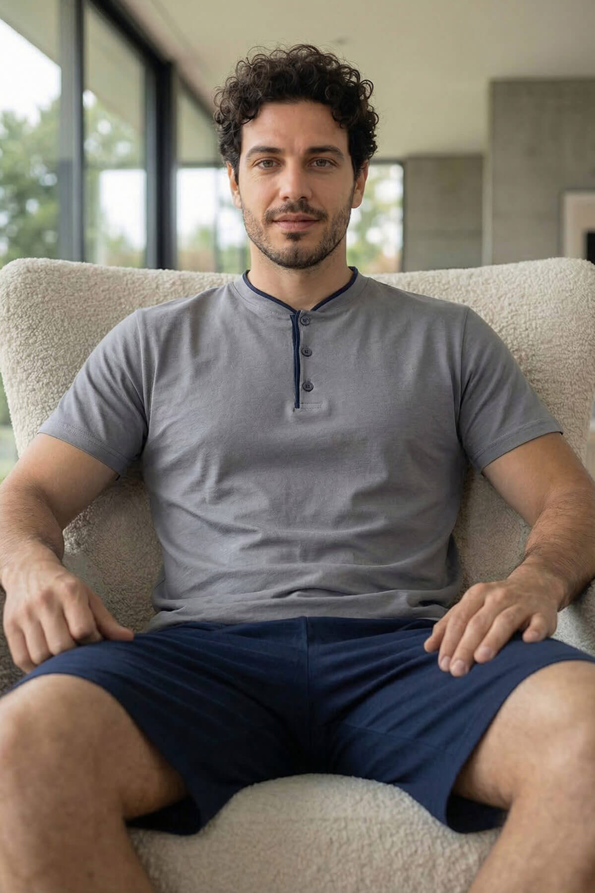 Pijamaevi Premium Erkek Şortlu Pijama Takımı, %100 pamuk kumaşı ve üst düzey işçiliği ile ev giyiminde konforu yeniden tanımlar. Nefes alabilen doğal yapısı sayesinde terletmez, gün boyu ferah ve rahat bir kullanım sunar.