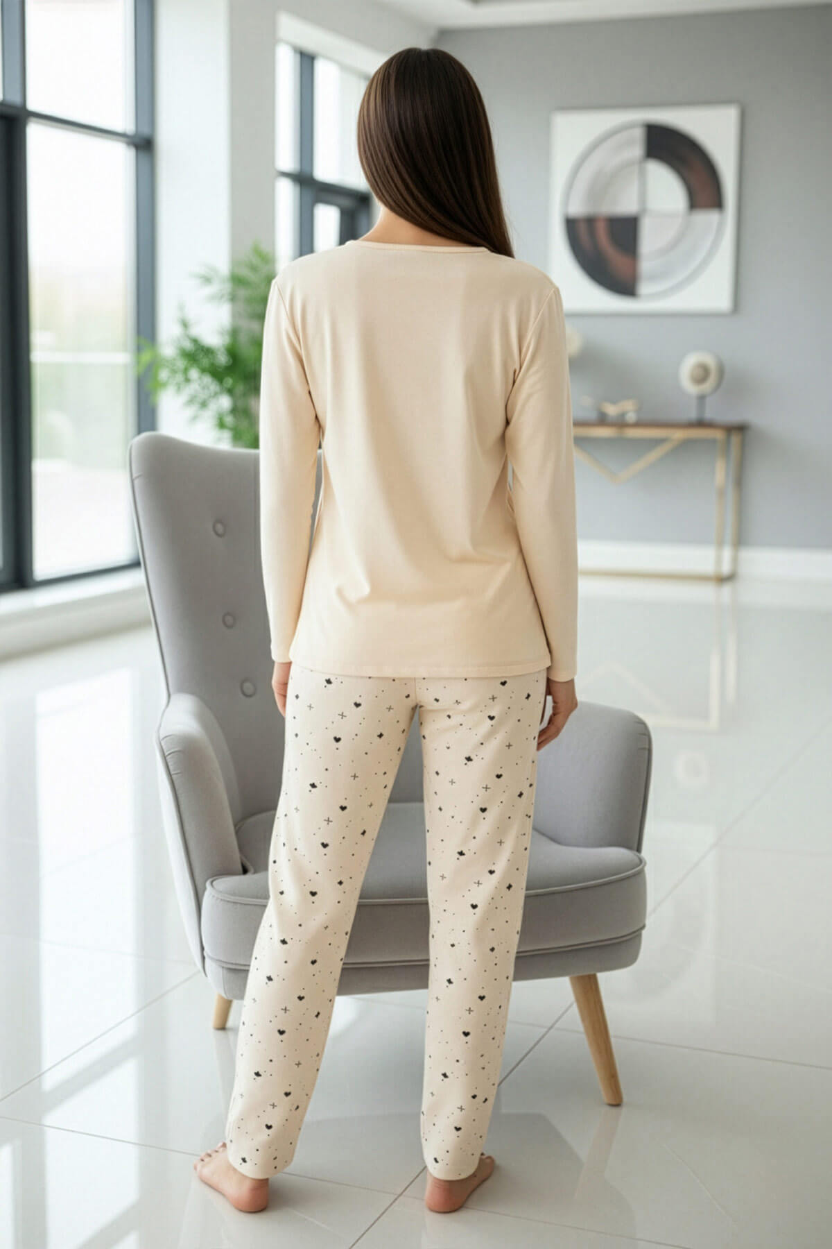 Gri Beautiful Desenli Uzun Kollu Bambu Örme Kadın Pijama Takımı