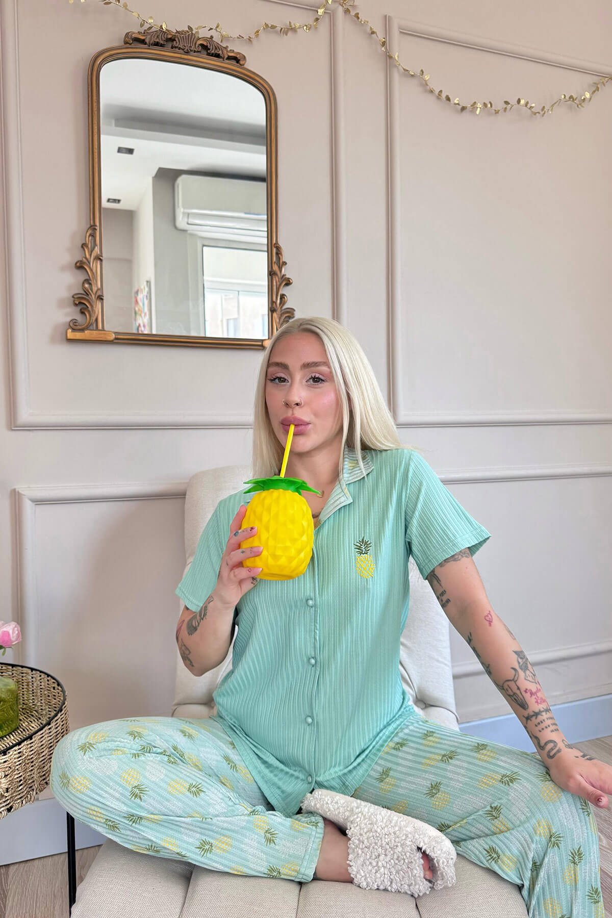 Yeşil Ananas Desenli Zincir Önden Düğmeli Kısa Kol Kadın Pijama - 1