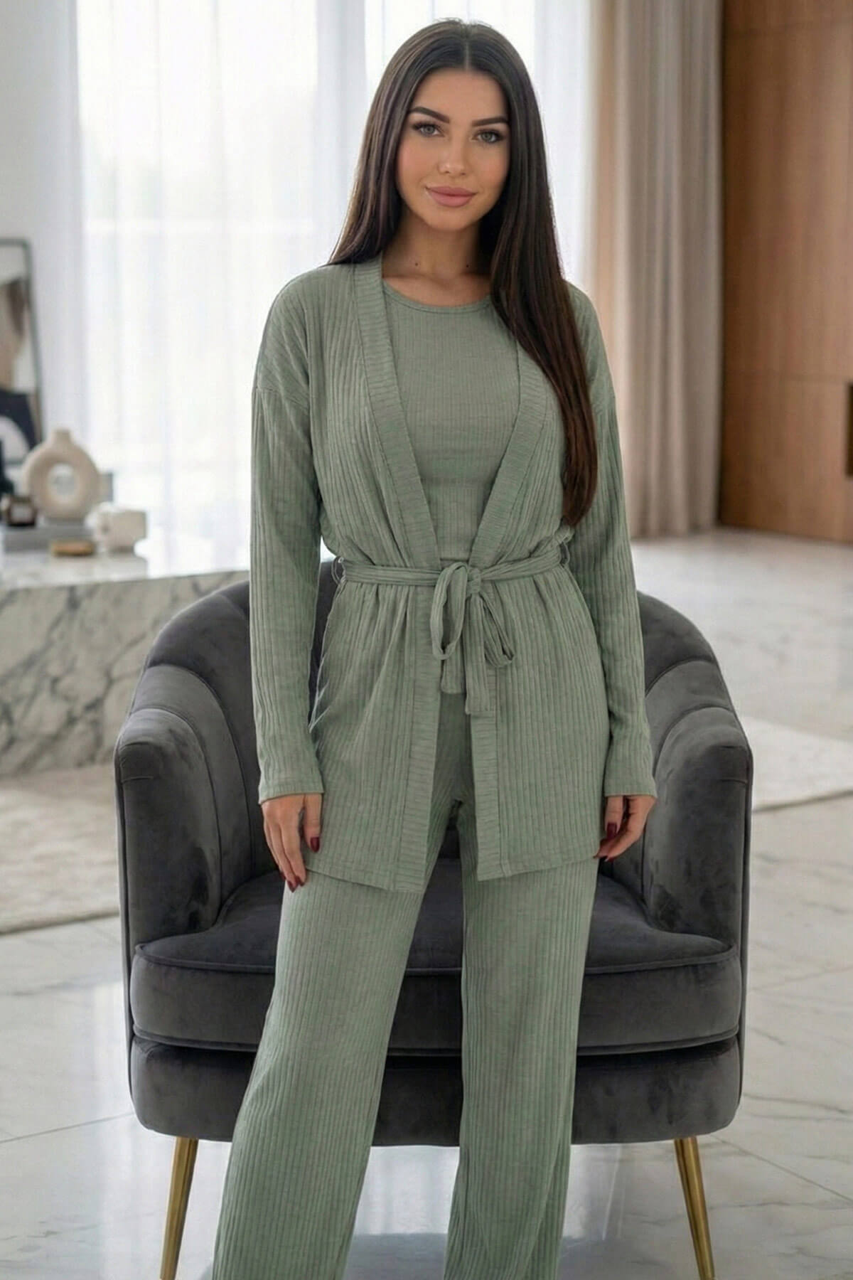 Şık Detaylar: Sabahlık belden bağlamalı, pijama takımı dökümlü ve zarif kesimlidir
