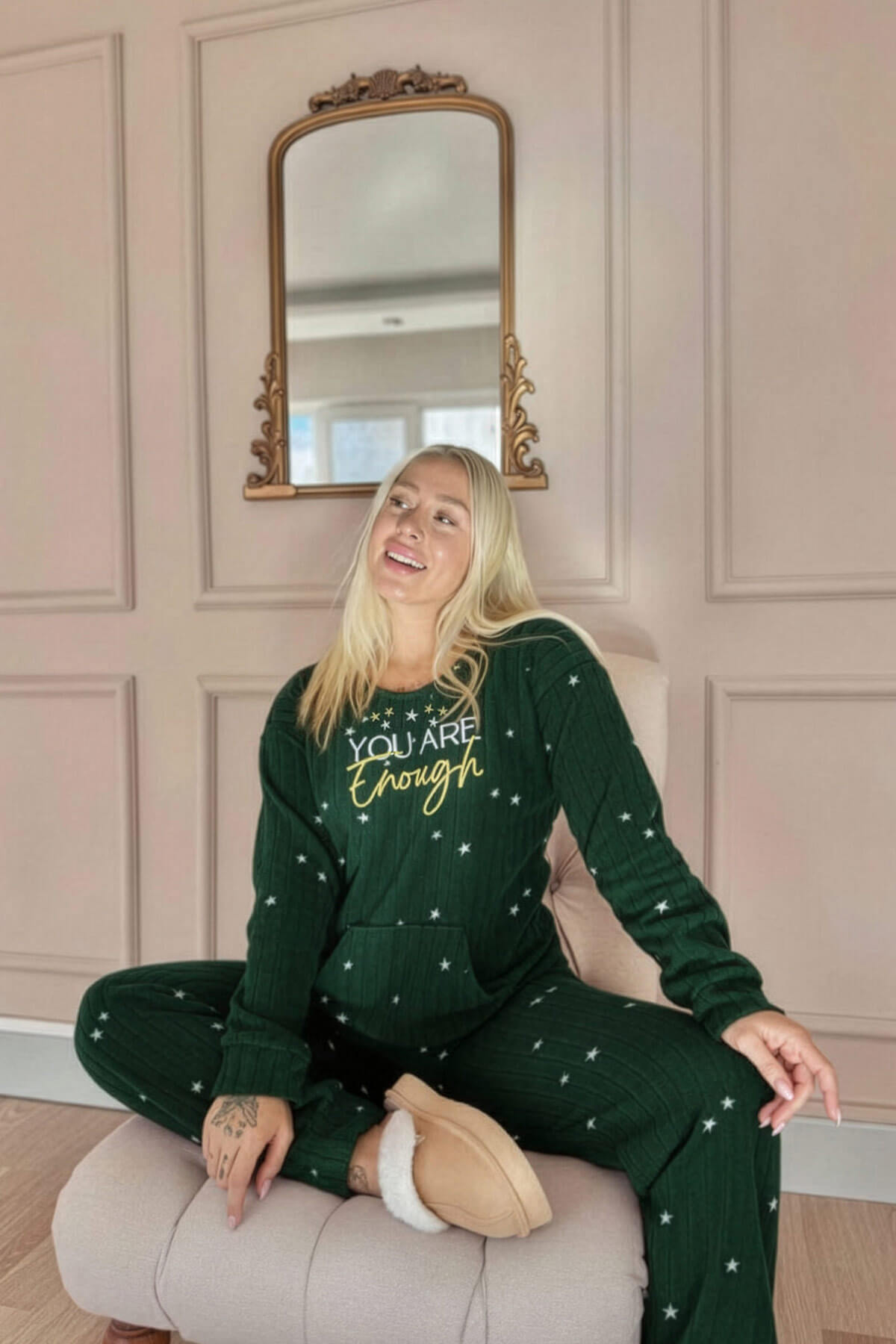 Yeşil Enough Desenli Kanguru Cepli Peluş Polar Pijama Takımı