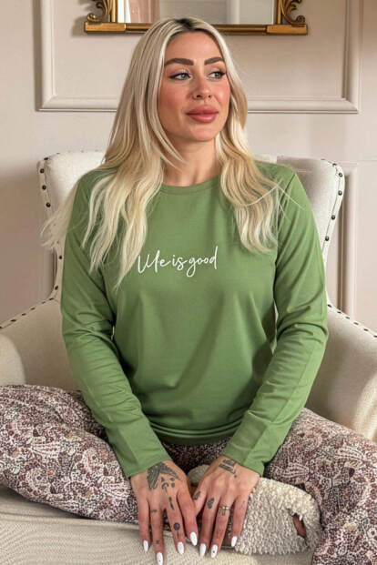 Yeşil Life is Good Desenli Uzun Kollu Bambu Örme Kadın Pijama Takımı