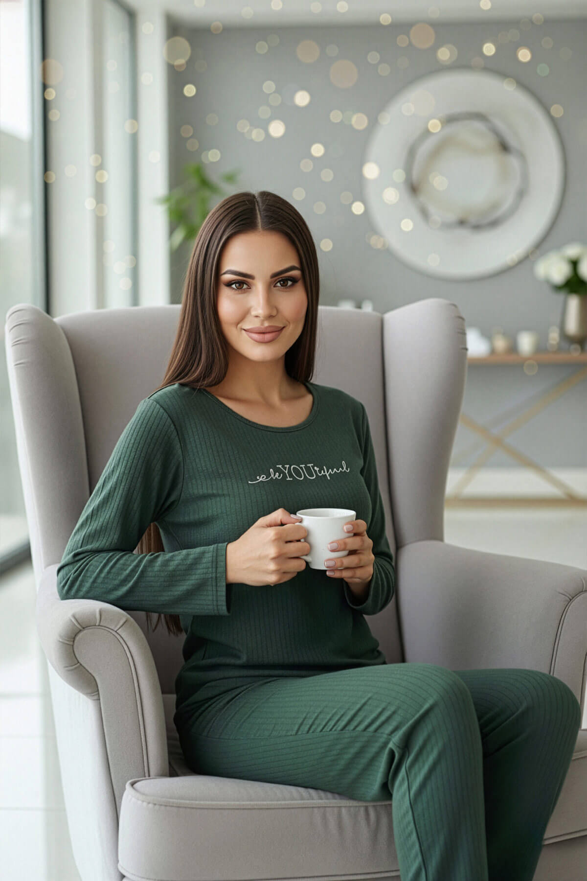 Zümrüt You Desenli Uzun Kollu Dublin Örme Kadın Pijama Takımı